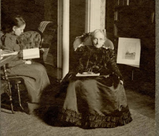 With bills mounting, the Downeys welcomed boarders into their home. They were fortunate in that Butler University officials moved the campus from north of downtown Indianapolis and into Irvington. Some of those first tenants included students, but their most prominent renters were the Merrill sisters. Much has been been written about Catharine Merrill over the years. A beloved teacher, she made history, as one of the earliest female university professors in the United States. A brilliant woman, she lived in Europe from 1859 until 1861 where she studied German. In Ireland she witnessed beggars from the potato famine. In England, she visited a great exhibition featuring artwork by Joseph Turner. In Italy, she wrote about the efforts of people to unite that country just as her own country fell apart and into the Civil War. While living in the Downey home, Miss Merrill had access to the "western parlor" where she held salons every Thursday evening. Students, professors, and neighbors attended these events where there might be poetry readings, book discussions, or even games. Young Joseph Downey recalled sitting on the lap of Butler professor, David Starr Jordan, who drew various kinds of fish on a piece of paper for him. Miss Merrill's kindness towards the Downey children was never forgotten. After Miss Merrill retired from Butler University, she moved out of the Downey home. One year later, the Downeys also moved away.